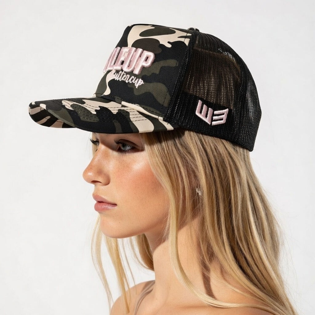 This bold Buckle Up Buttercup snapback delivers attitude in a dark camo print that’s equal parts stealth and sass.